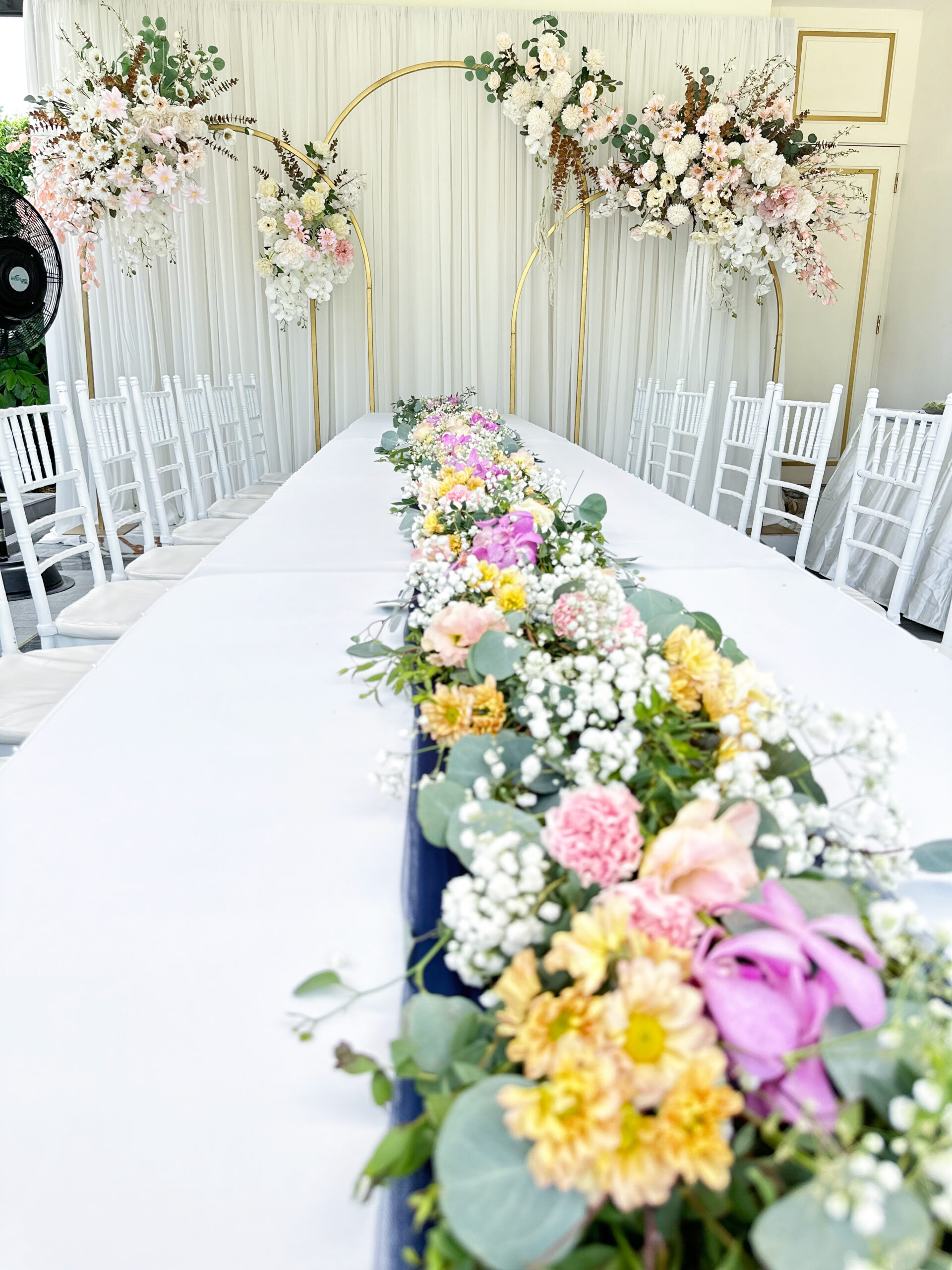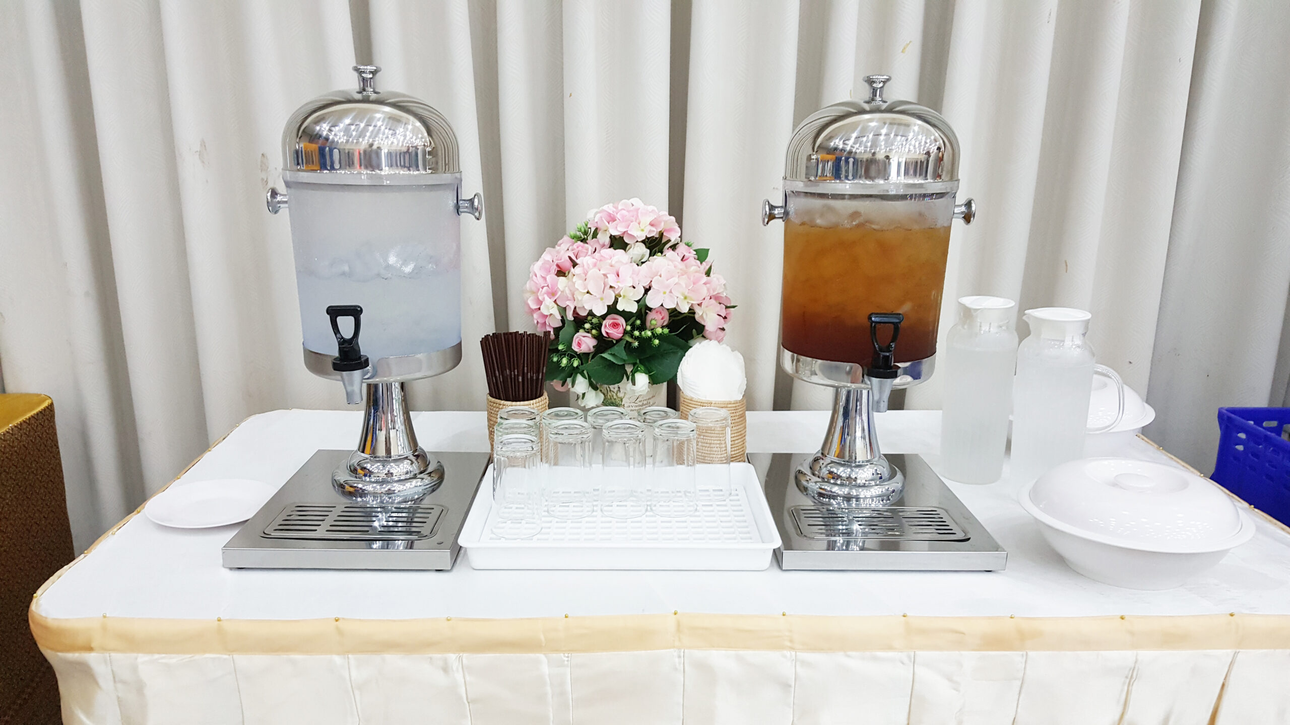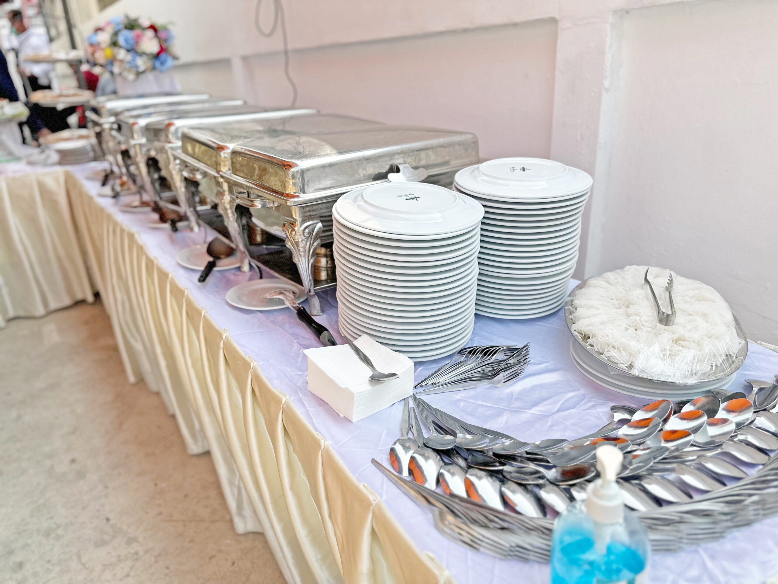 - โต๊ะวางอาหาร พร้อมผ้าคลุมตกแต่งโต๊ะ